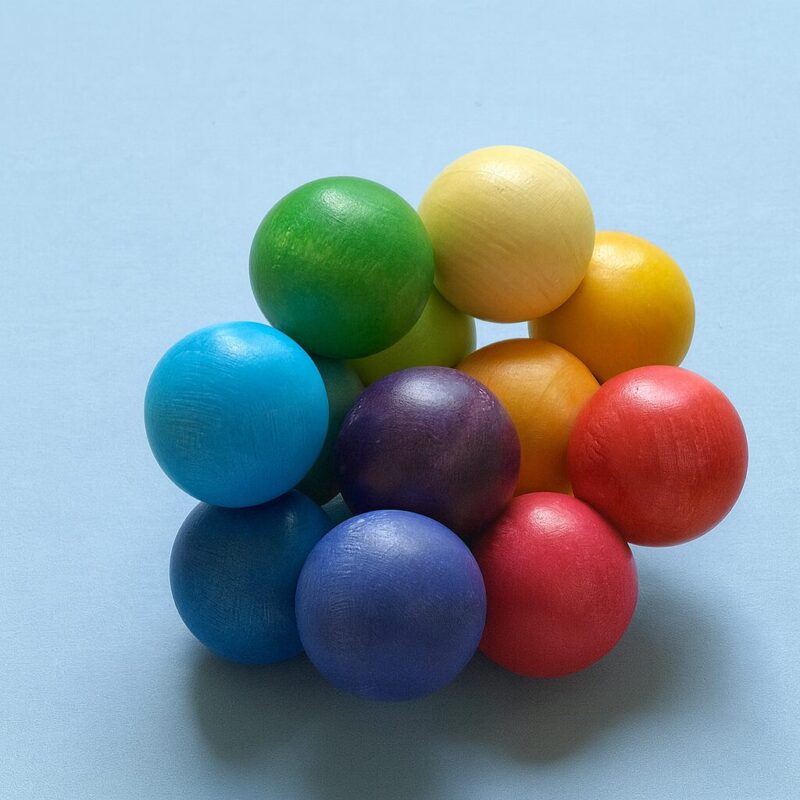 天然のカエデ(メープル)100%で作られた12個のカラーボールが、やわらかいゴムで連結された赤ちゃん向けのおもちゃです。