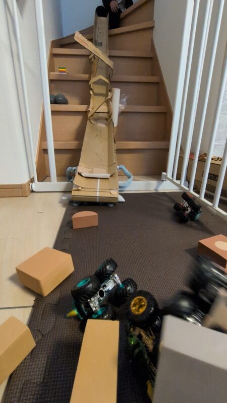 この前息子はブロックでお城を作って段ボールで作ったジャンプコースから走らせてモンスタートラックで体当たりしていました。